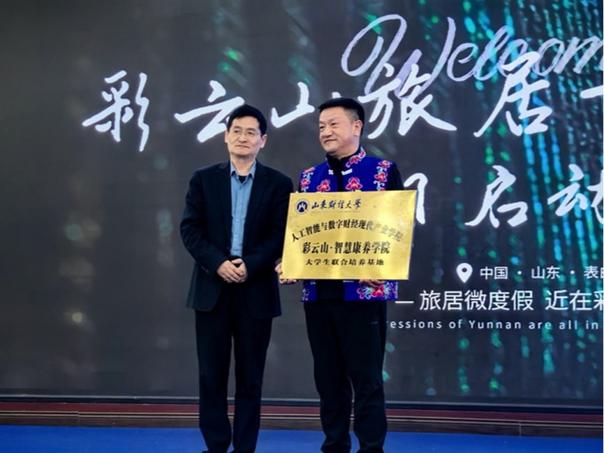 人工智能与数字财经现代产业学院与山东云山集团经过前期调研和洽谈,决定共同建设服务银发经济的产教融合平台-“彩云山・智慧康养学院”。韩慧健在会上致辞。他首先对“彩云山健康旅居”项目启动表示祝贺,对致力于打造融合云南民族文化的景区与康养基地表示赞赏。介绍了人工智能与数字财经现代产业学院的建设情况,以及“把大学建在产业一线,与产业一起与时俱进发展”的建设理念和宗旨。特别强调在国家大力推进银发经济发展的背景下,双方合作建设产业学院分院“彩云山・智慧康养学院”意义重大。未来将依此为平台,落实产教融合,为康养基地培养既懂康养知识,又能熟练运用人工智能技术的复合型人才,为基地的持续发展提供强有力的智力支持和技术支持,打造智慧康养与文化、科技、教育融合的康养产业典范。然后,韩慧健向山东云山集团授 “人工智能与数字财经现代产业学院彩云山・智慧康养学院(大学生联合培养基地)”铜牌。