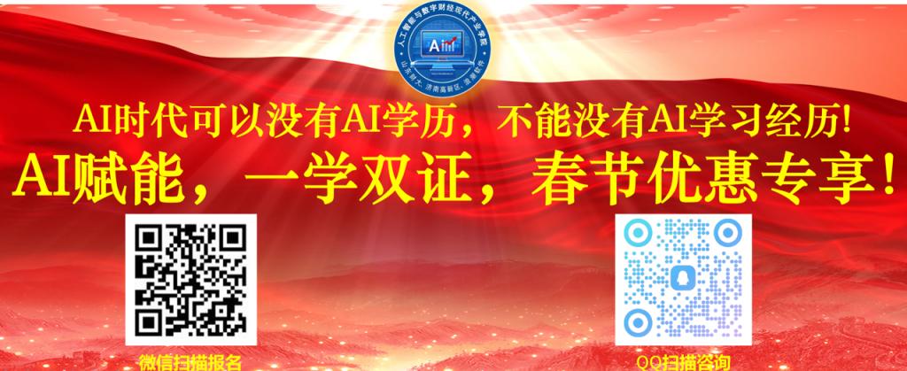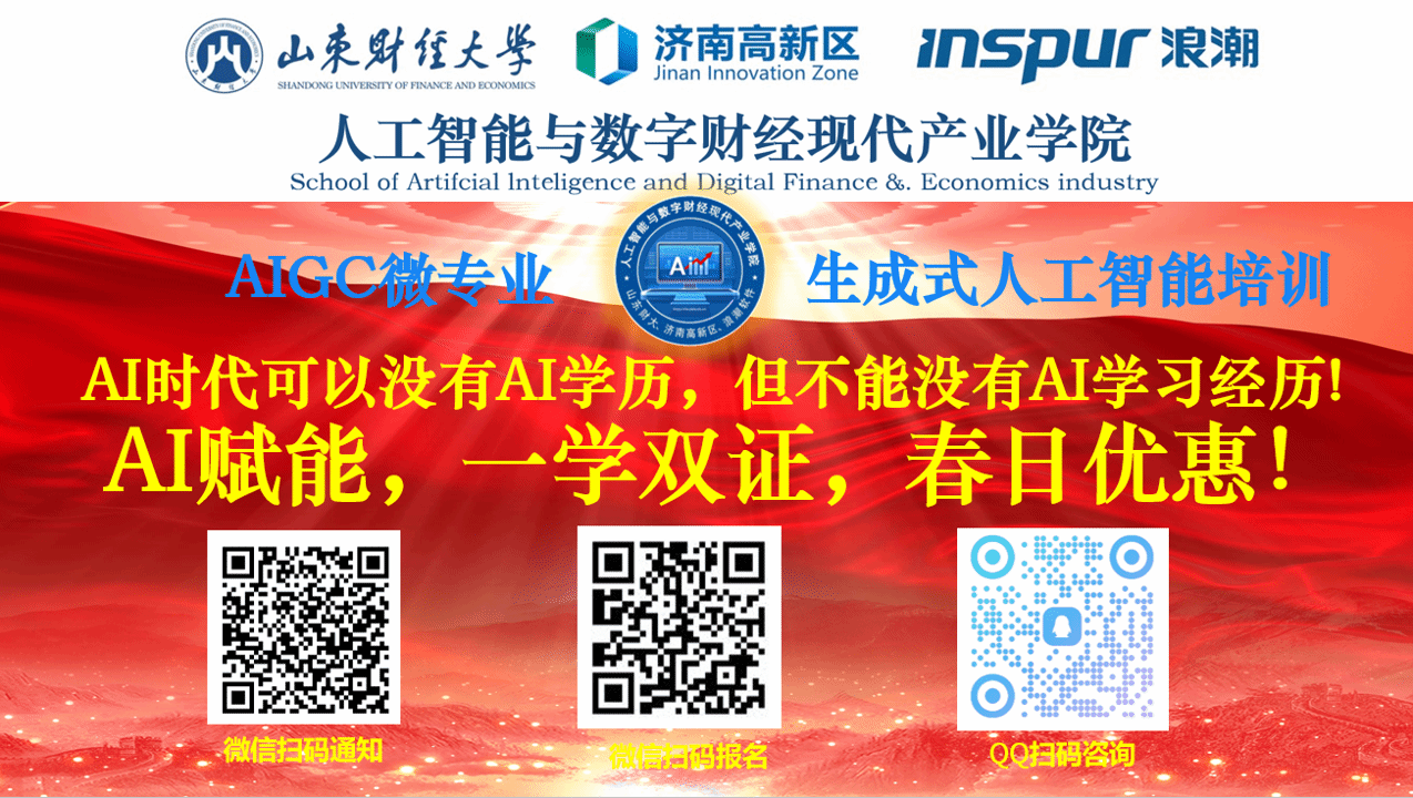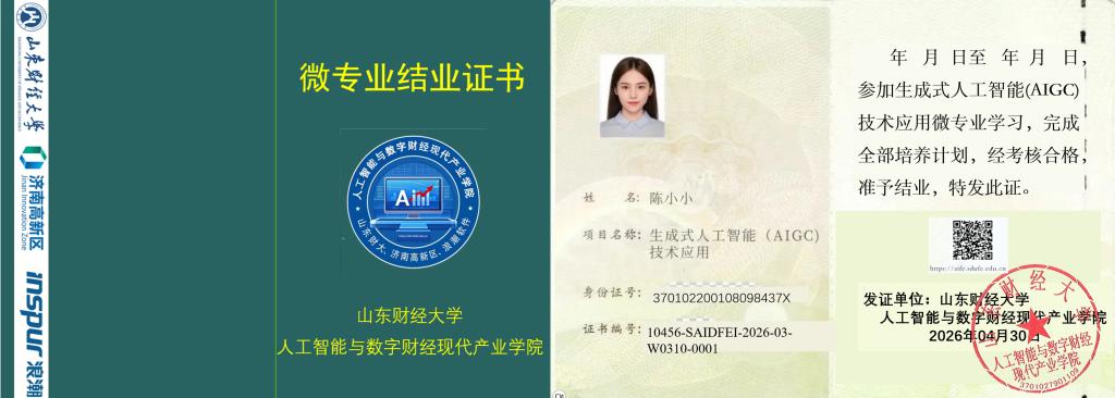 2. 一学双证硬核:学员完成全部课程学习并通过考核后,可同时斩获两大证书 ——(1)人力资源和社会保障部社会保障能力建设中心颁发的《生成式人工智能(AIGC)技术应用职业技能培训证书》(全国通用,可作为求职就业技能凭证)—(2)山东财经大学人工智能与数字财经现代产业学院颁发的《生成式人工智能(AIGC)技术应用微专业结业证书》(高校专业学习经历认证,助力学业提升与职业竞争力升级)。助力您成为驾驭未来生产力的先行者。